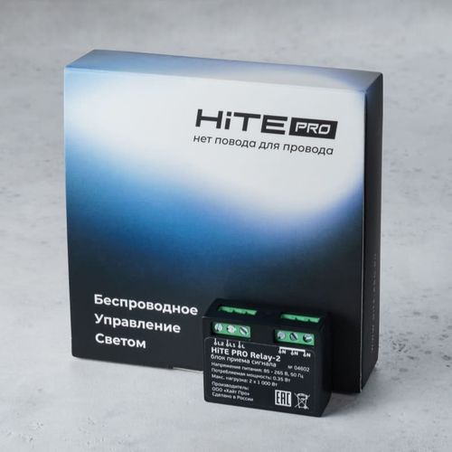 Компактный двухканальный блок радиореле Relay-2 подключается к светильнику или другому электроприбору, которым нужно управлять с помощью передатчиков или сервера умного дома HiTE PRO. Получая от них сигнал блок Relay-2 замыкает/размыкает электрическую цепь.