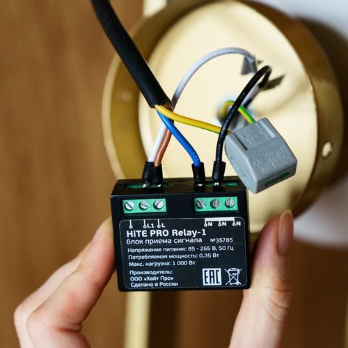 Компактный одноканальный блок радиореле Relay-1 подключается к светильнику или другому электроприбору, которым нужно управлять с помощью передатчиков или сервера умного дома HiTE PRO. Получая от них сигнал блок Relay-1 замыкает/размыкает электрическую цепь.