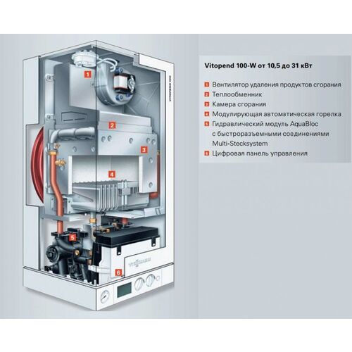 Газовый комбинированный водогрейный котел со встроенным пластинчатым теплообменником для приготовления горячей воды.